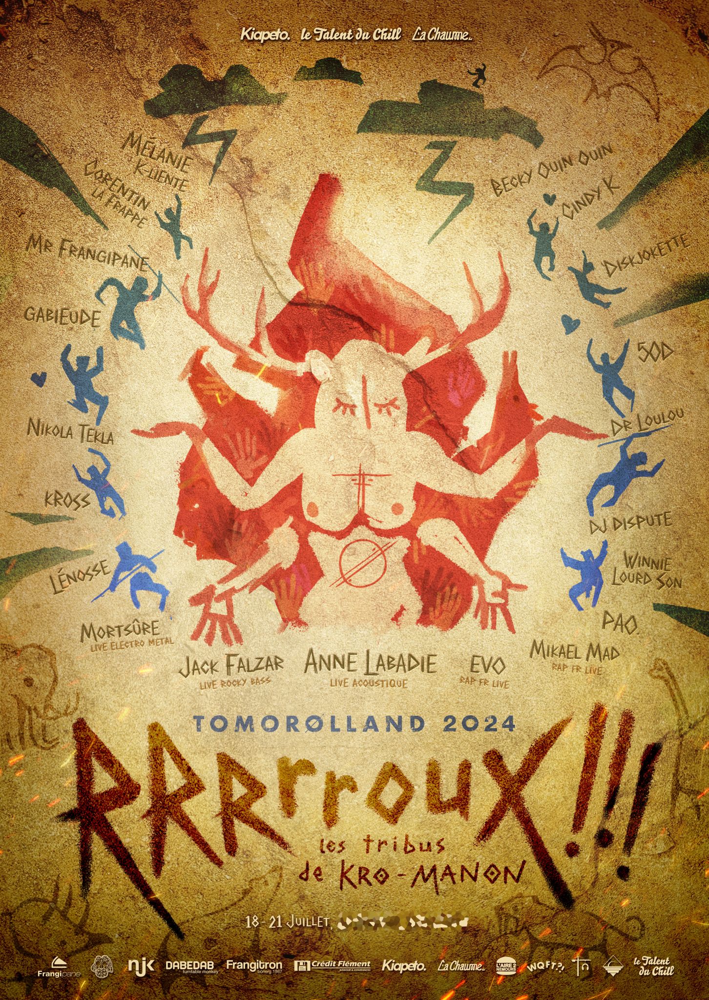Affiche du Tomorolland 2024 illustré suivant le thème annuel et mentionnant les artistes se produisant durant l'évènement.